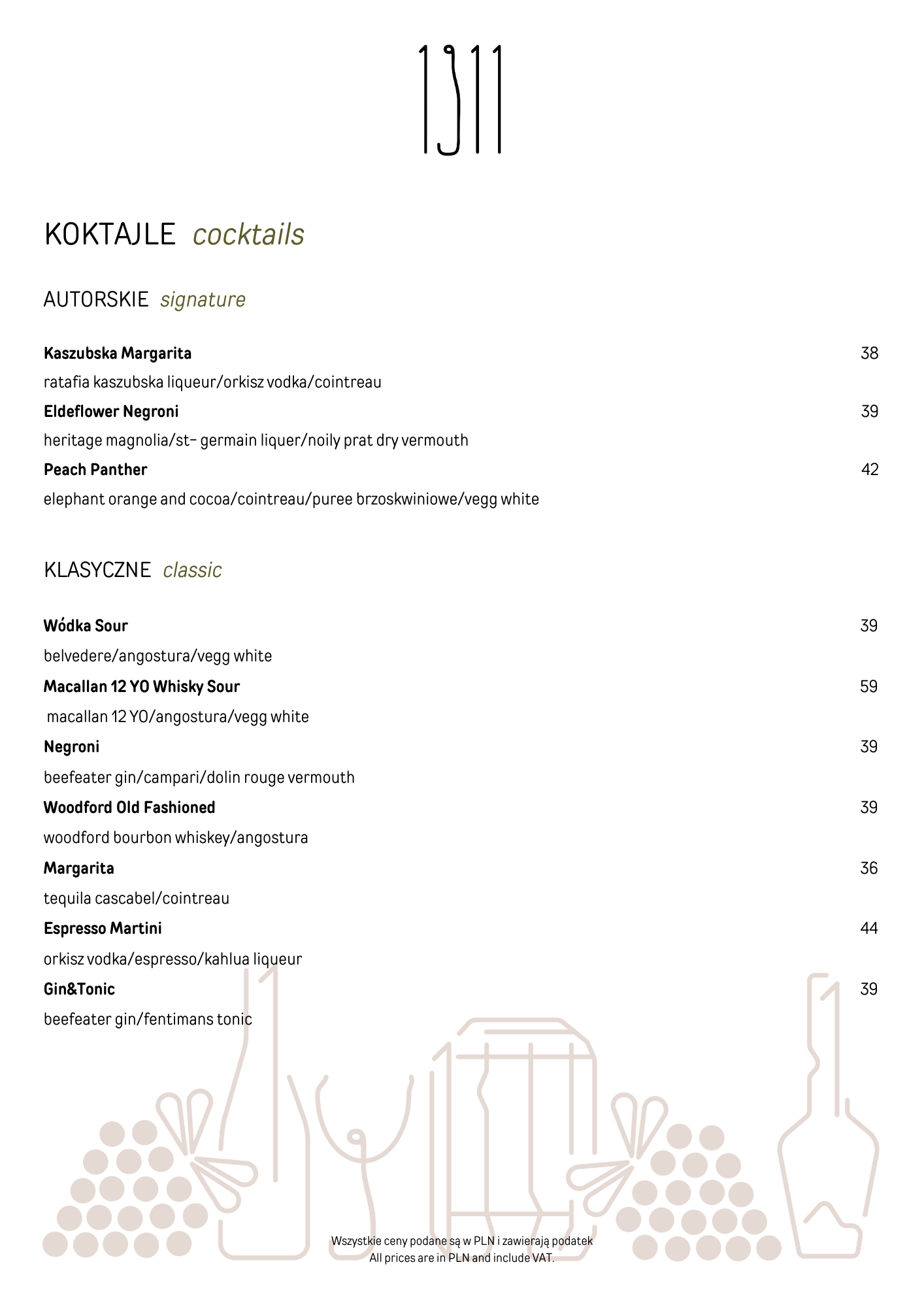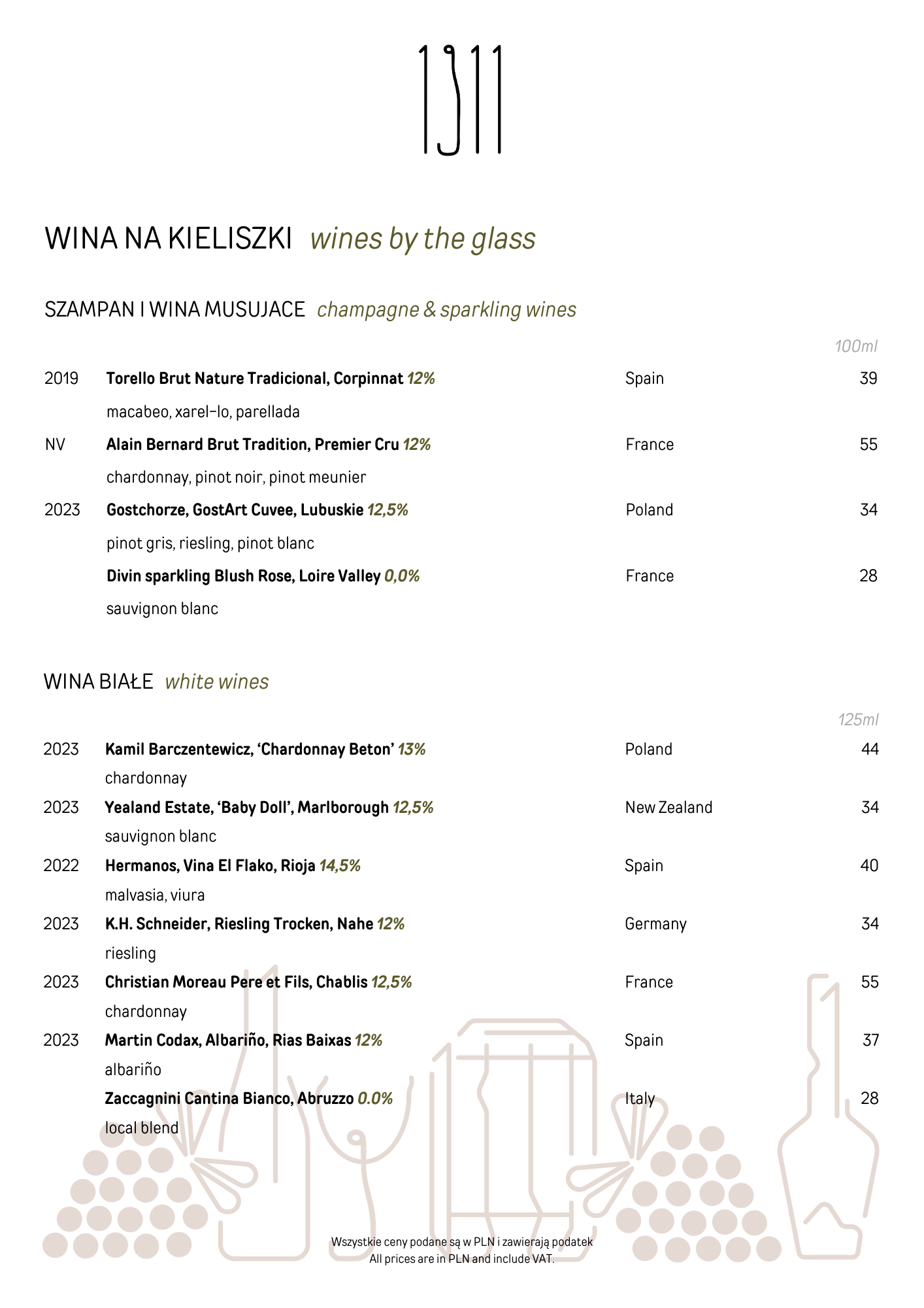 Uzupełnieniem każdego posiłku są napoje. Karta win w 1911 Restaurant tak jak nasze menu jest przekrojem nieszablonowych butelek.